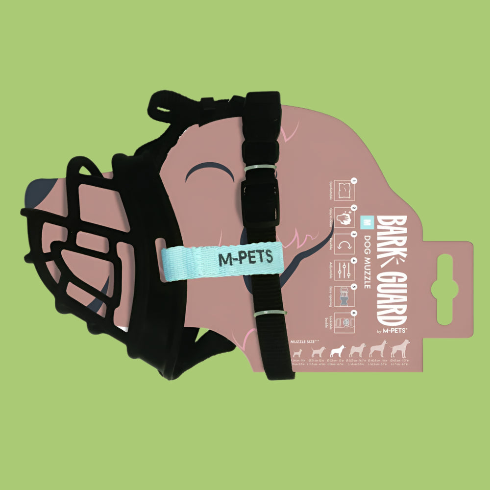 מחסום הכלבים BARK GUARD של M-PETS® נושם, קל ונוח במיוחד. עשוי TPE ופוליאסטר, עם רצועות מתכווננות להתאמה מושלמת לכלב לחוץ או נרגש.